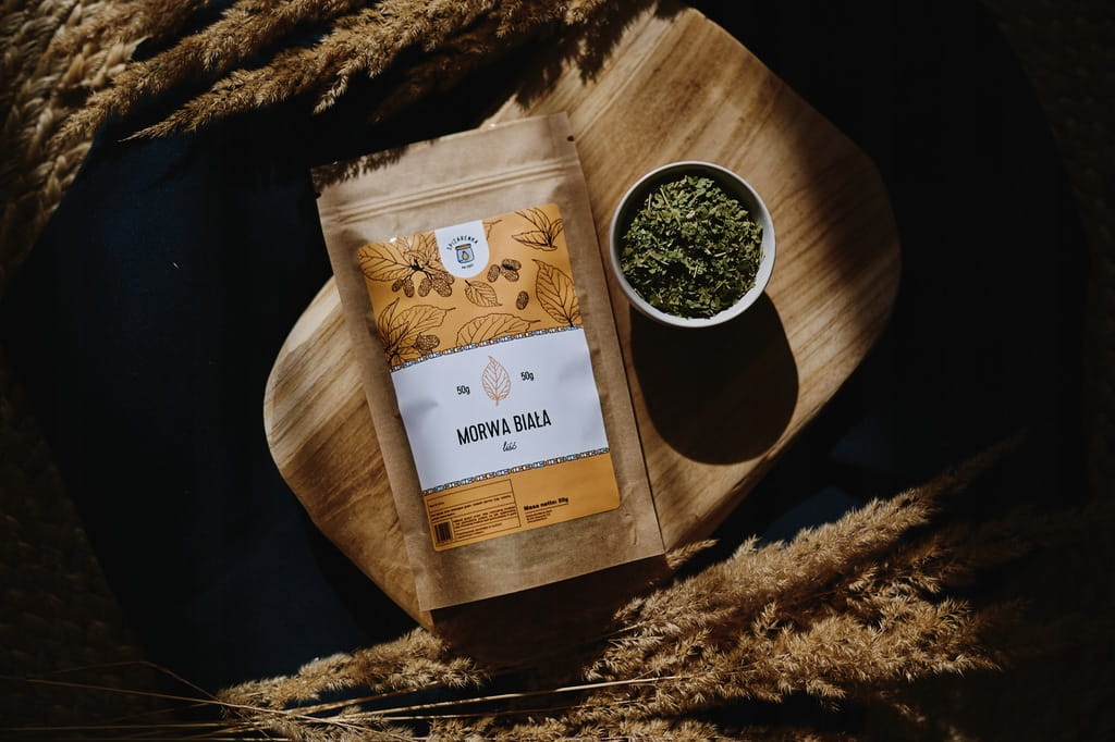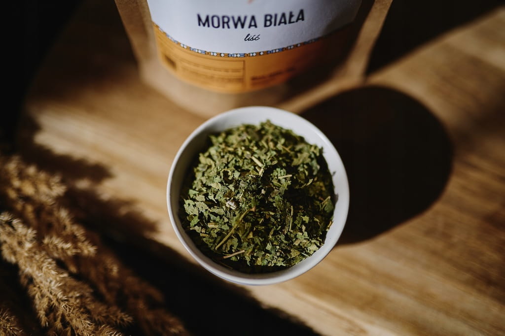 ✔ Napar z liści morwy – klasyczne, ziołowe wsparcie – wystarczy 1 łyżka suszu na szklankę gorącej wody, parzyć ok. 10–15 minut.