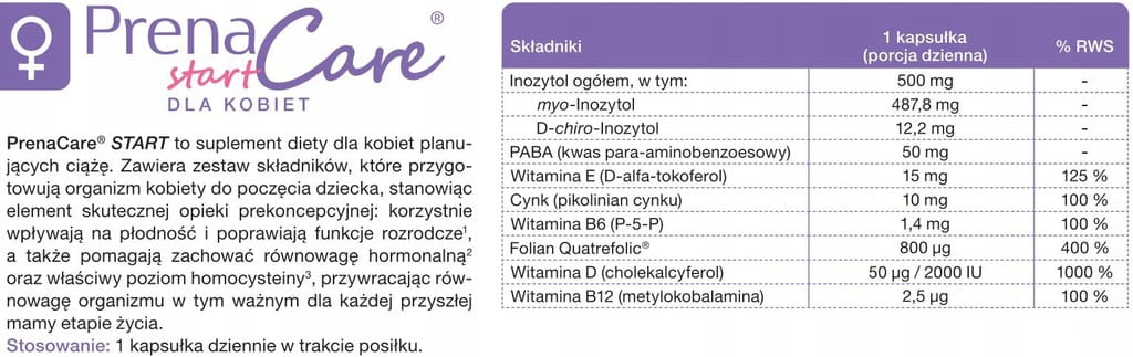 PrenaCare® START dla kobiet od Aliness, to kompleksowe wsparcie dla kobiet planujących ciążę. Produkt zawiera składniki rekomendowane przez Polskie Towarzystwo Ginekologów i Położników (PTGiP): witaminę D i kwas foliowy w postaci aktywnego folianu, witaminę B6 i B12, a także witaminę E i cynk. Oprócz tego skład wzbogacono w dodatkowe substancje odżywcze, które korzystnie wpływają na płodność i prawidłowe funkcje rozrodcze, pomagają zachować równowagę hormonalną oraz właściwy poziom homocysteiny, przywracając równowagę organizmu w tak ważnym dla każdej przyszłej mamy etapie życia.