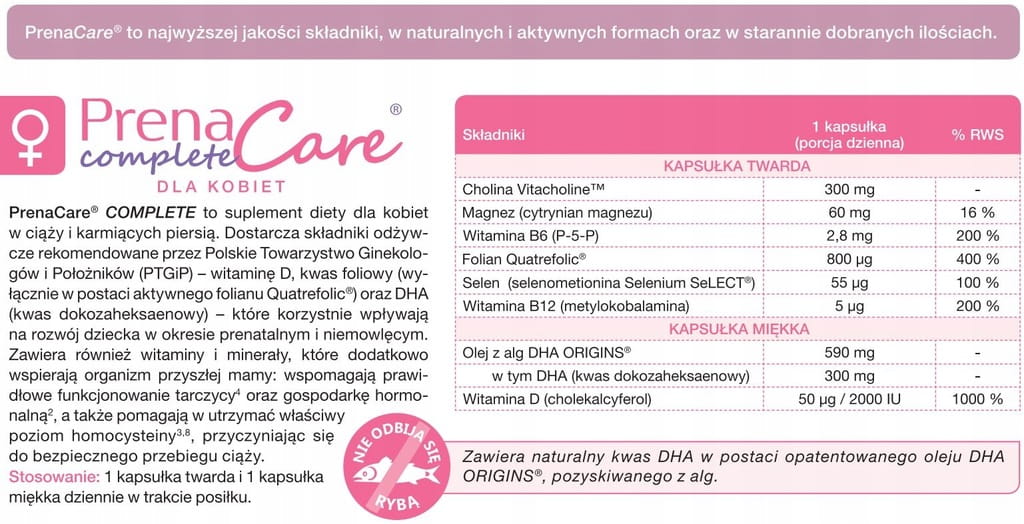 PrenaCare®Complete dla kobiet w ciąży i karmiących to kompleksowe wsparcie suplementacyjne dla kobiet przez cały okres ciąży oraz karmienia piersią. Produkt dostarcza składniki odżywcze rekomendowane przez Polskie Towarzystwo Ginekologów i Położników(PTGiP) – witaminę D, kwas foliowy (w postaci aktywnego folianu) oraz DHA (kwas dokozaheksaenowy) – które korzystnie wpływają na rozwój dziecka w okresie prenatalnym oraz karmienia piersią.