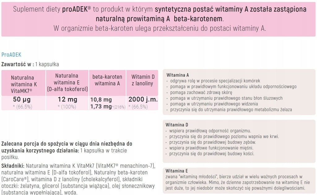 Suplement diety ProADEK® to produkt w którym syntetyczna postać witaminy A została zastąpiona naturalną prowitaminą A – betakarotenem. Organizm ludzki przekształca naturalny betakaroten do postaci witaminy A. Ten z kolei odgrywa ważną rolę w procesie specjalizacji komórek, pomaga w prawidłowym funkcjonowaniu układu odpornościowego i przyczynia się do utrzymania prawidłowego metabolizmu żelaza. Przede wszystkim witamina A pomaga jednak w utrzymaniu prawidłowego widzenia niwelując tzw. „kurzą ślepotę”, czyli nieprawidłowość widzenia po zmroku i przy słabym świetle. Pełni także funkcję regeneracyjną w procesie zachowania zdrowej skóry, będąc często składnikiem wszelkich maści. Należy jednak pamiętać, że witaminy A w codziennym dawkowaniu powinny wystrzegać się kobiety w ciąży.